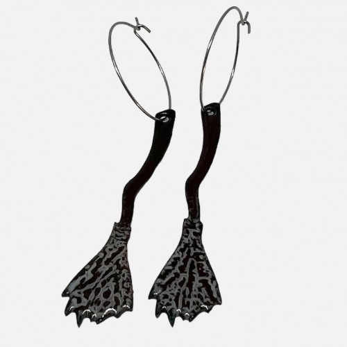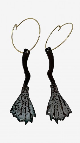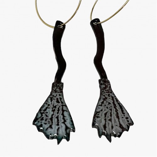 Cut out of copper and enameled with several layers of bold and brilliant porcelain enamel, these witchie broomsticks are sure to be a Halloween Hit!! Broomsticks measure a little over 2" long and hangs on a 1" brass or stainless steel hoop earwire.