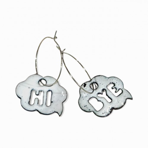 Cut out of copper and enameled with several layers of bold and brilliant porcelain enamel, these earrings are sure to put a smile on everyone's face! Smiley measures approximately 1" and hangs on a 1" brass or stainless steel hoop earwire.