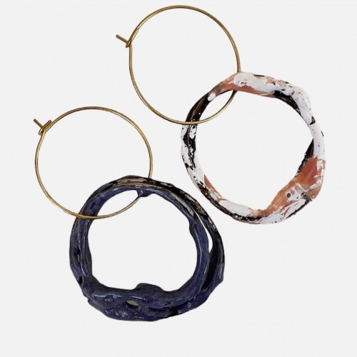 Forged out of steel wire and enameled with several layers of bold and brilliant porcelain enamel, these loopy earrings are sure to be your new favorite! This loop measures approximately 1.25" and hang on a 1" brass or stainless steel hoop earwire. I only have one of these but have many more at my scheduled events.